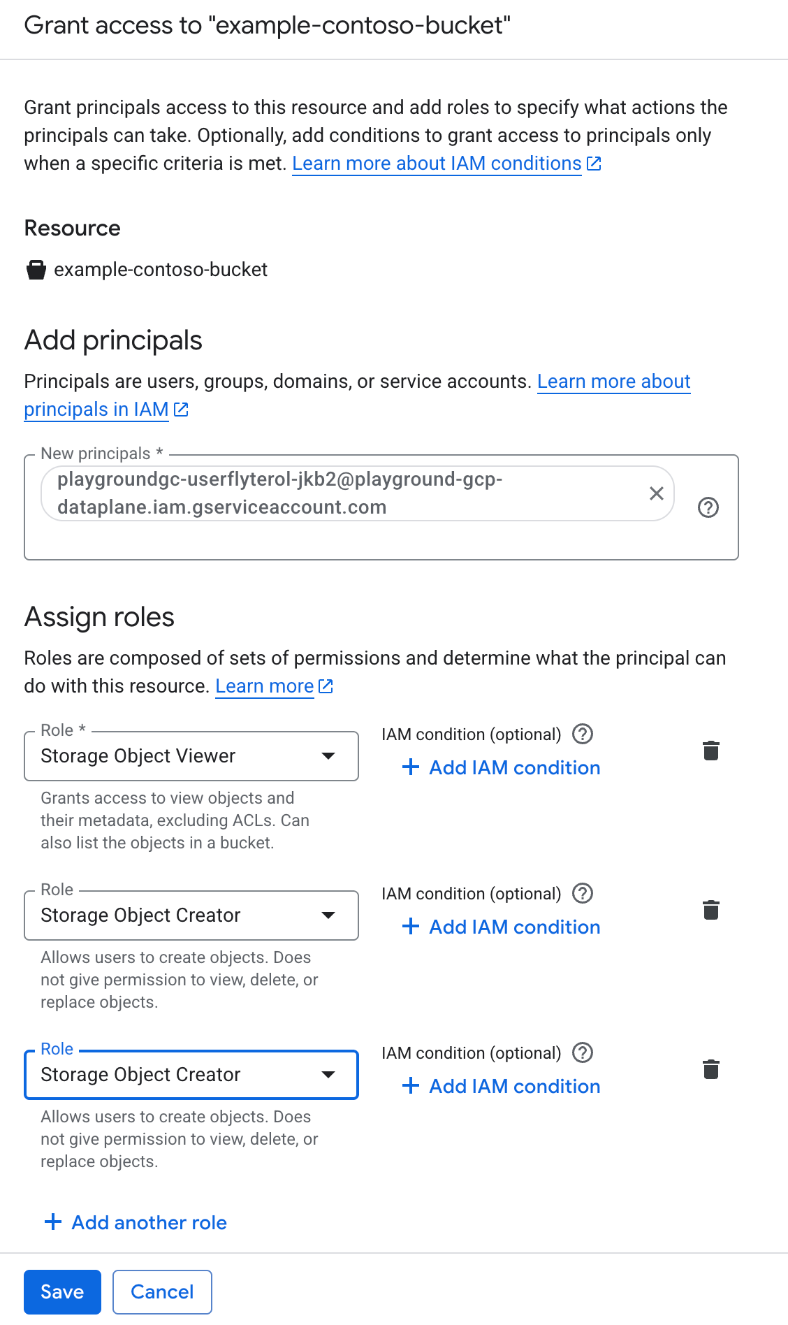 • Under Add principals, paste the actual name (in email form) of the <UserFlyteGSA> into the New principals field.